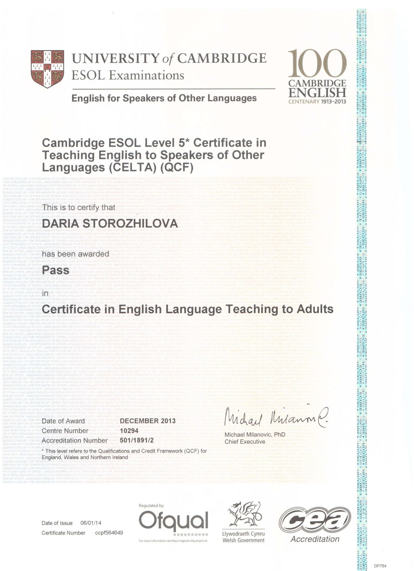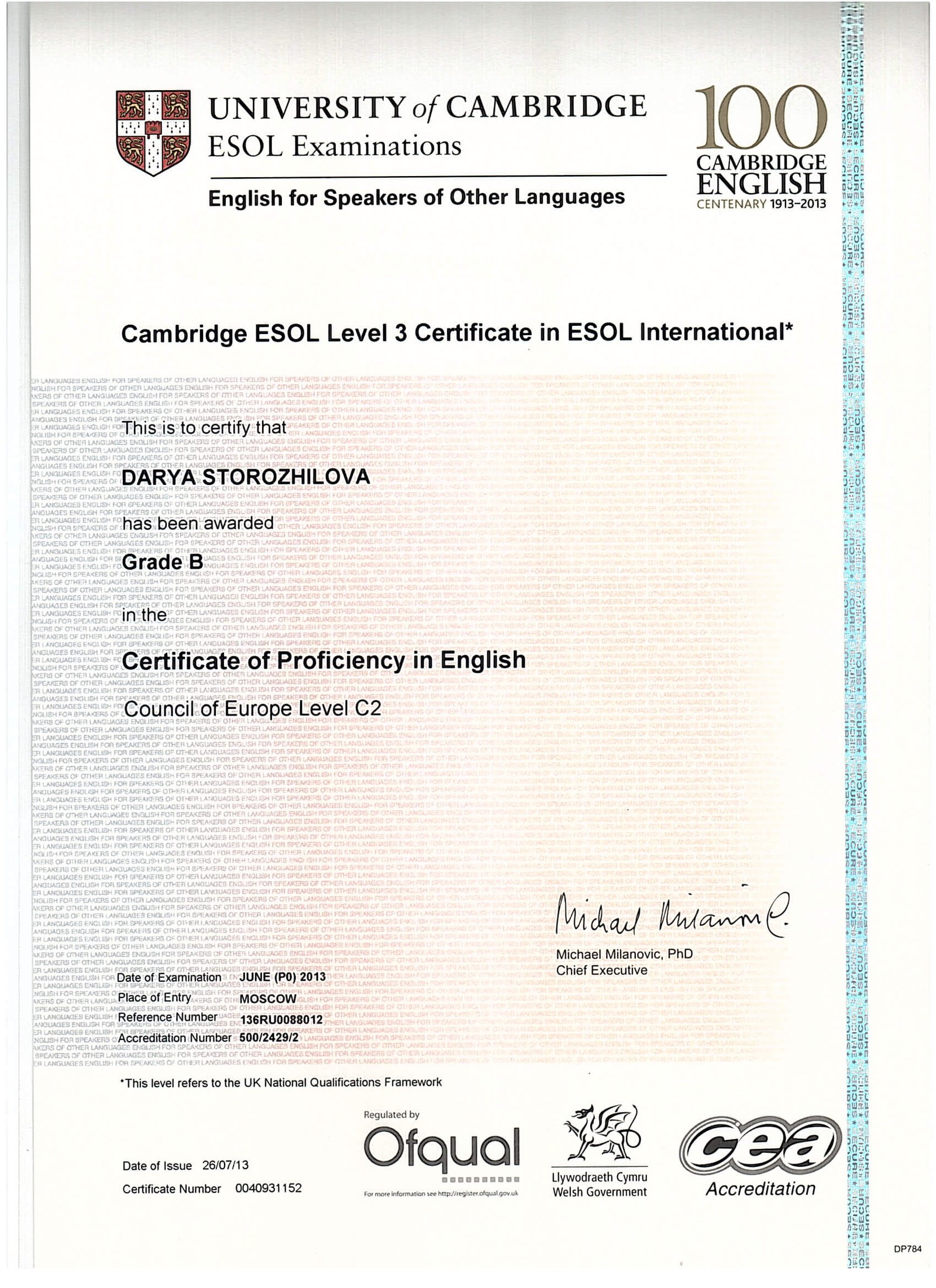 • сертификат владения английским на уровне родного (Cambridge University 2013г)