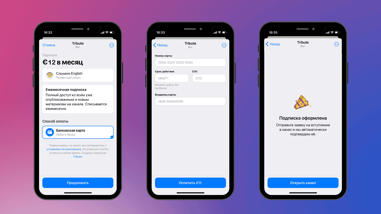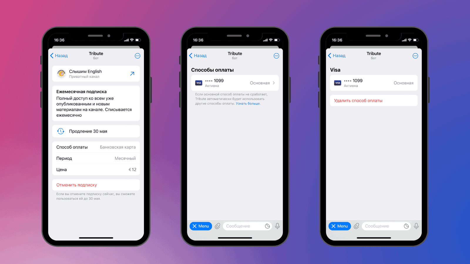 Вы можете посмотреть данные о своей подписке, отменить подписку или изменить способ оплаты в боте Tribute - нажмите здесь, чтобы открыть бота.