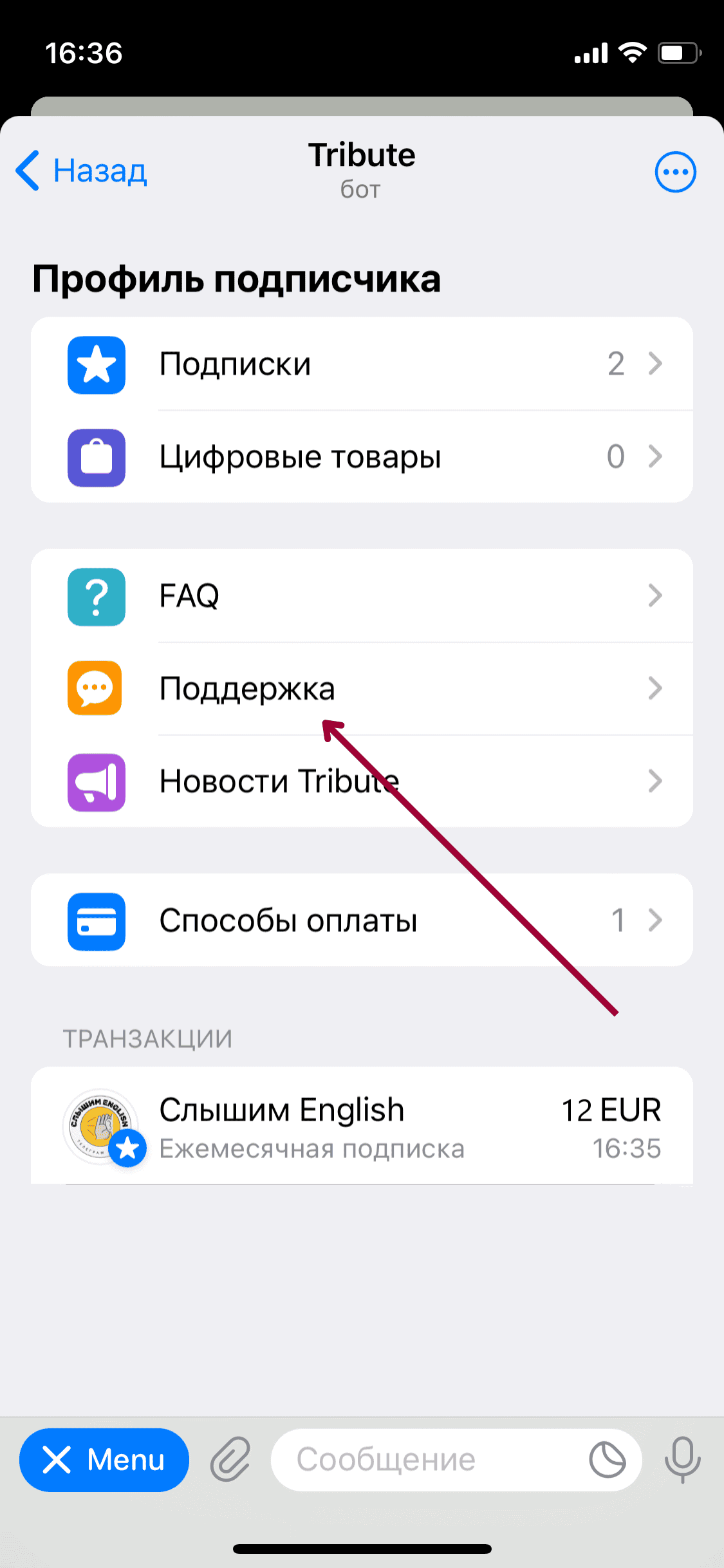 Задать вопросы по поводу оплаты подписки и получить помощь вы можете круглосуточно в поддержке бота Tribute, нажав на кнопку Поддержка в Профиле подписчика. Для этого перейдите в бот Tribute по ссылке и нажмите Поддержка: